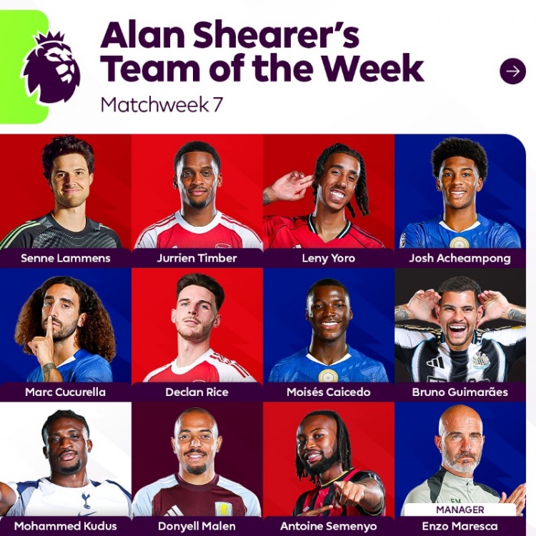 10月6日讯 英格兰足坛名宿希勒评出了英超第7轮比赛最好气势,凯塞多、赖斯、库杜斯、约罗、拉门斯在列,主帅马雷斯卡。