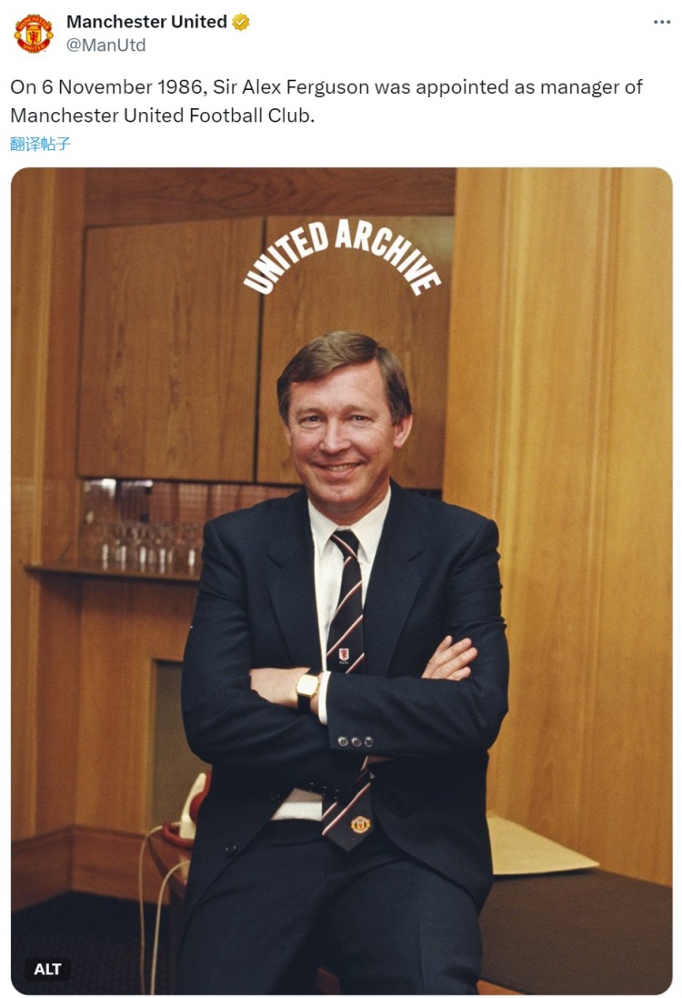 1986年11月6日,弗格森被任命为曼联主帅,曼联官方社媒晒出弗格森的相片,挂牵这个极端的日子。