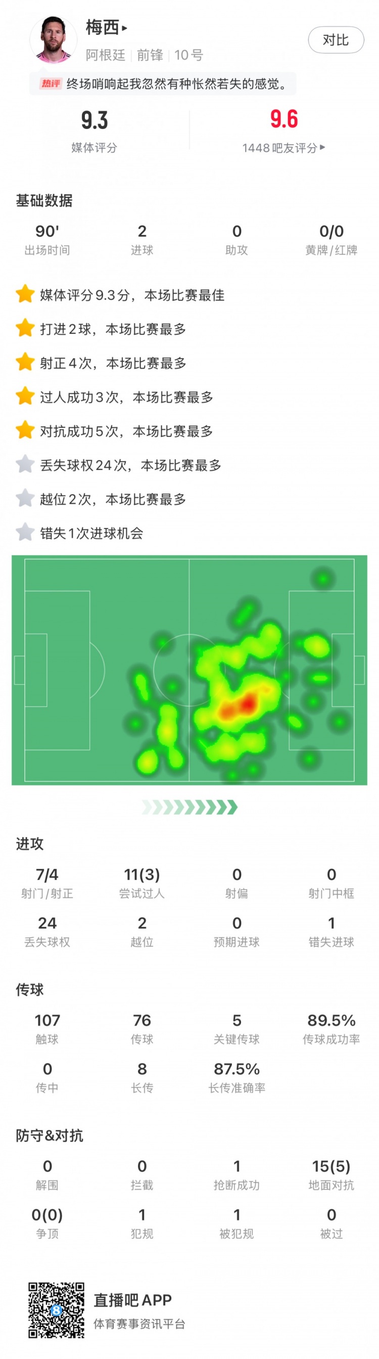 球王实力!梅西全场数据:双响+5次短处传球,评分9.3全场最高