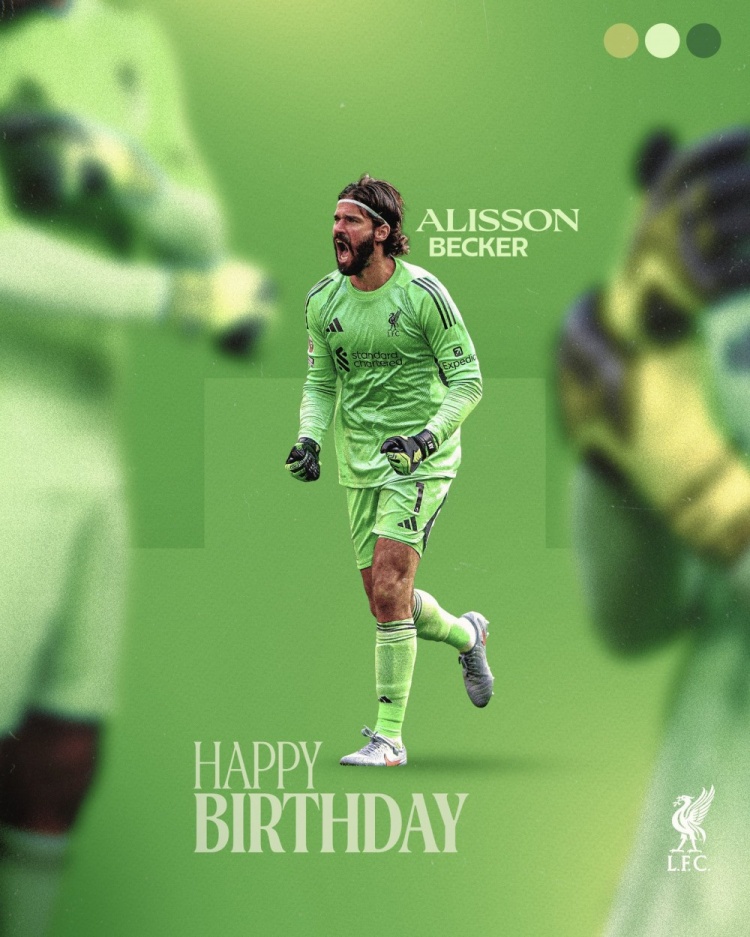利物浦官方社媒晒出为阿利森制作的诞辰海报,配文:“诞辰欢娱,阿利森。”