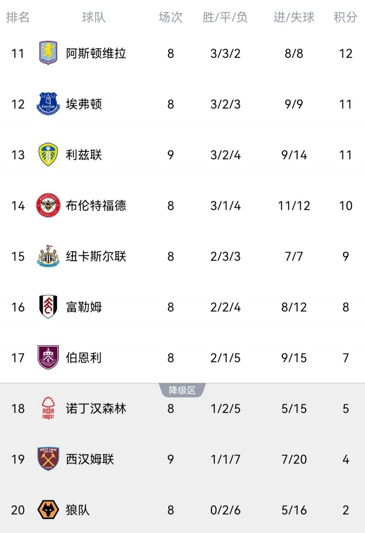 但在努诺接办西汉姆之后,球队1平3负照旧未始胜绩,现在积4分暂时排在英超倒二,如若狼队本轮取胜,西汉姆就将掉到倒一的位置。