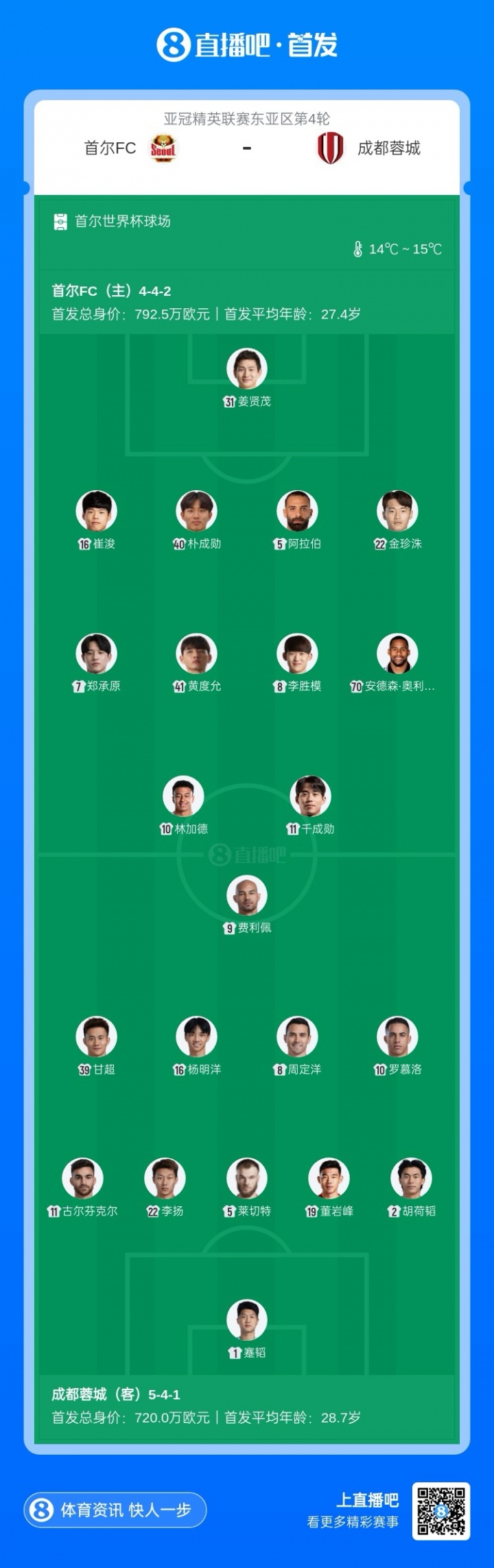 本轮赛前,成王人蓉城1胜0平2负积3分排行东亚区第9,处于晋级区外;首尔FC则是1胜1平1负积4分位列第6。蓉城近期各项赛事3轮不堪。