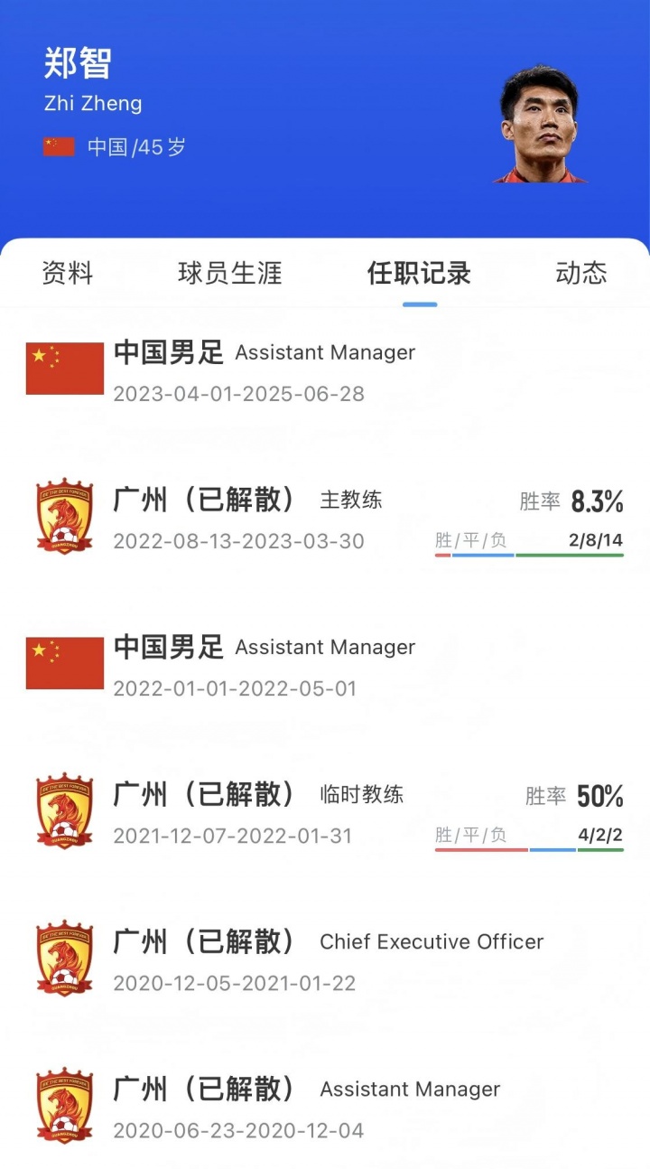 2021年12月7日,郑智出任广州队实践主教学兼球员。2022年1月,41岁的郑智出战广州队vs长春亚泰的中超比赛,这是他劳动糊口终末一次出场。2022年8月,郑智出任广州队主教学。 2023年2月27日,郑智出任国足助教 。跟着伊万离任,郑智也退放洋足助教团队。