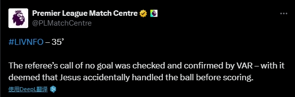 英超官方讲明这一判罚:裁判判罚进球无效,经由VAR裁判阐述,热苏斯进球前失慎用手触球。