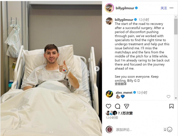 “接下来的一段日子,我会念念念比赛日和球迷们,但我已迫不足待重返赛场,并将全力专注于目下的康复征途。民众很快再会。保抓浅笑,比利(吉尔莫)!”
