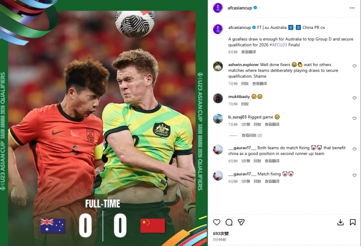 外网球迷指摘国足0-0澳大利亚:真可耻!两队沿路踢了场假球🤡