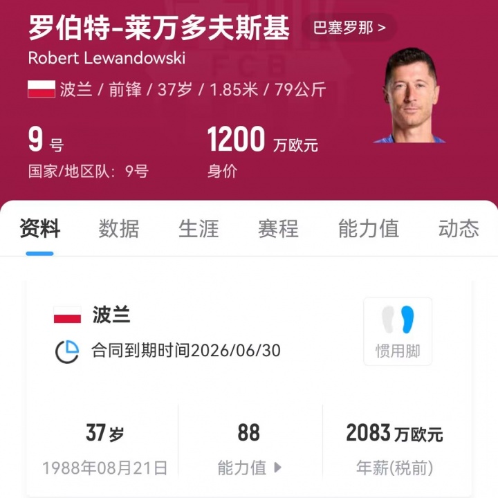 09月30日讯 现在37岁的莱万多夫斯基现在与巴萨的协议还是干预临了一年,将于2026年6月30日到期。