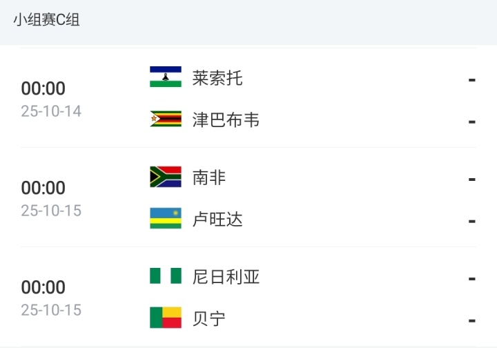 当今C组积分榜上,贝宁2分领跑;南非因派出非法球员,对阵莱索托的比赛被判0-3负,随后又遭垫底队逼平,当今逾期2分;坐拥奥斯梅恩、卢克曼、伊沃比等名将的尼日利亚逾期3分。