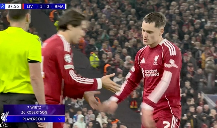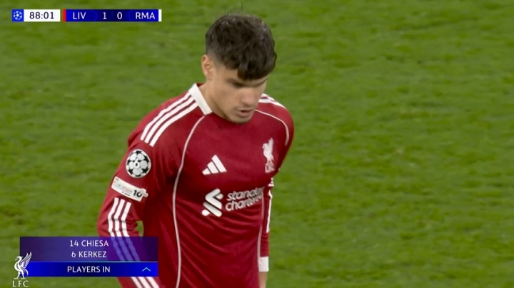 11月05日讯 欧冠第4轮利物浦vs皇马第89分钟,利物浦再次作念出2个换东谈主挪动,维尔茨、罗伯逊被换下,凯尔凯兹、基耶萨替补登场。