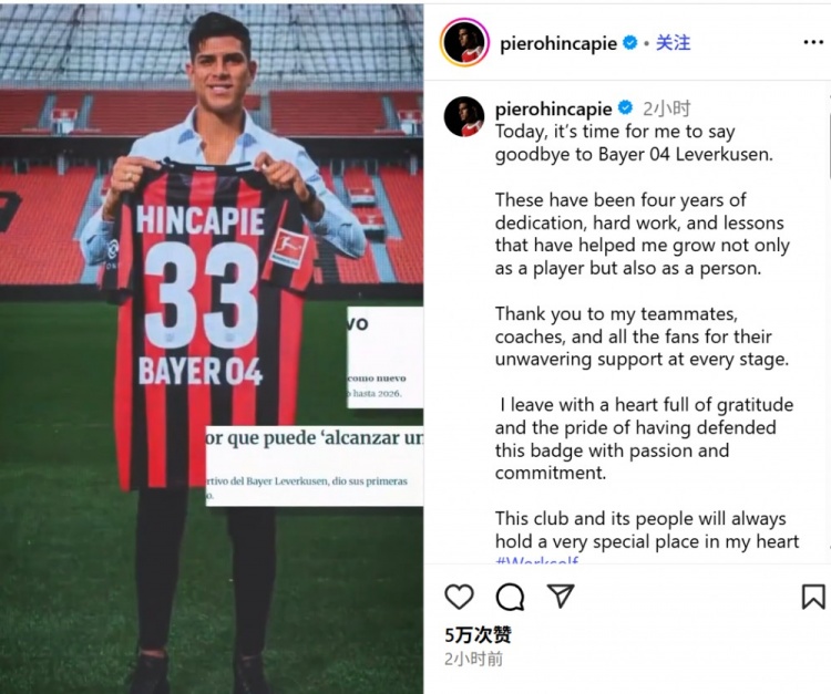 9月2日讯 阿森纳仍是官宣引进勒沃库森中卫因卡皮耶,后者也通过社媒发文向药厂告别: