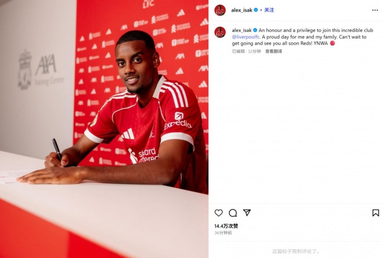 伊萨克示意:“很庆幸粗略加入利物浦这个不成念念议的俱乐部。对我和我的家东谈主来说,这王人是值得骄矜的一天。迫不足待地想尽快见到你们,赤军们!YNWA(永不独行) 🔴”