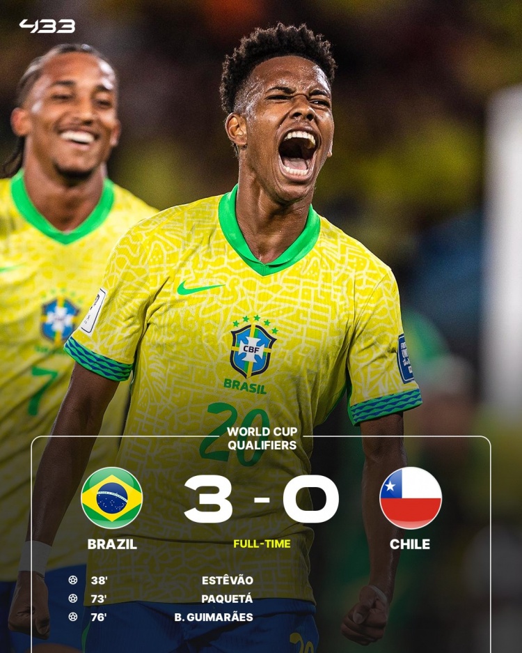9月5日讯 南好意思世初赛,巴西主场3-0完胜智利。本场比赛,切尔西小将埃斯特旺门前倒钩打进我方在巴西国度队的首球。