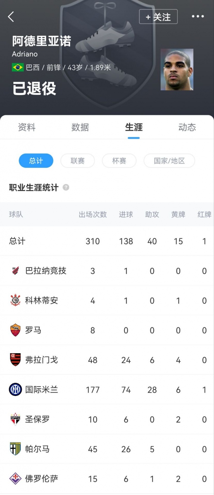 阿德里亚诺仍是43岁,他曾为国米出场177次打进74球。东说念主们大批合计阿德里亚诺从未充分阐扬出他的长久后劲,而他也一直承认父亲的横祸死一火让他分神,失去了情景和能源。