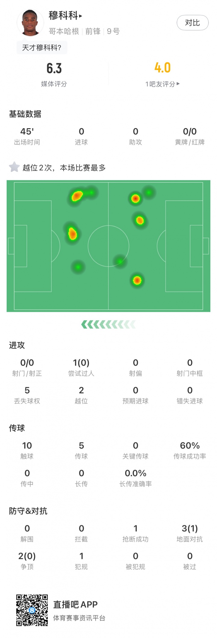 着力于哥本哈根的时尚穆科科此役出战半场便被换下。半场无射门越位两次,10次触球,5次传球,5次丢失球权,传球奏效率60%。