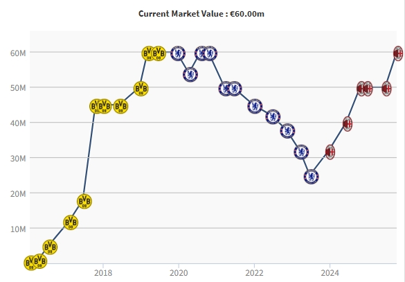 普利西奇曾在2019、2020年服从多特和切尔西技巧身价达到6000万欧,尔后一皆下落至2500万欧。