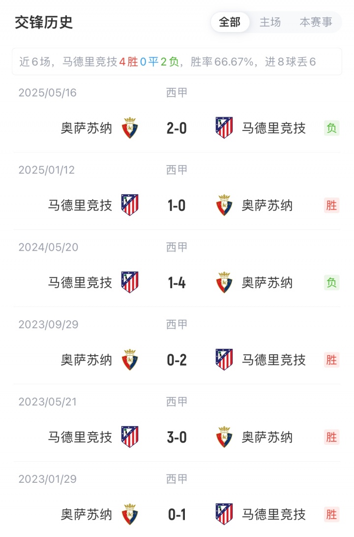 马竞联赛3胜4平1负积13分,主场各赛事已获利4连胜;奥萨苏纳联赛3胜1平4负积10分,客场碰到4连败。两边上一次交锋马竞客场0-2不敌奥萨苏纳。
