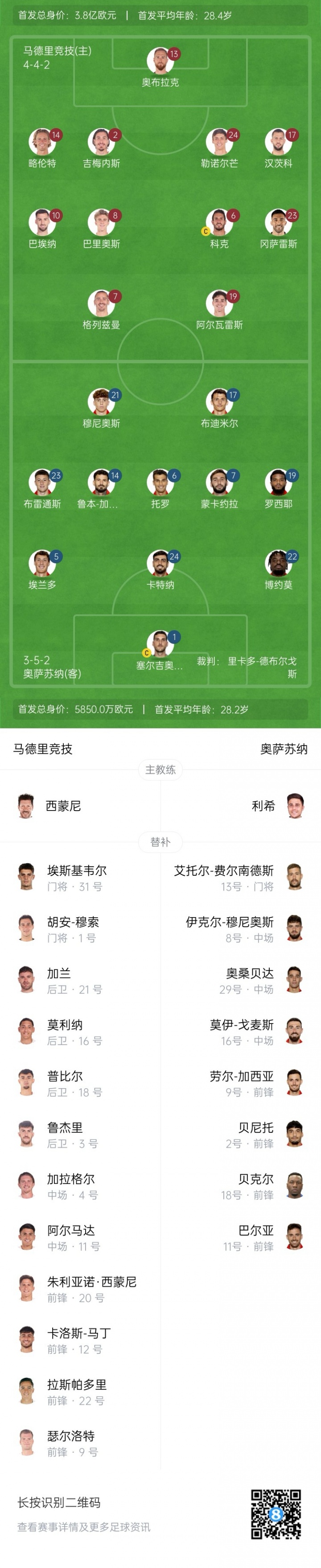 马德里竞技首发:13-奥布拉克、2-吉梅内斯、17-汉茨科、24-勒诺尔芒、14-马科斯-略伦特、6-科克、8-巴里奥斯、10-巴埃纳、23-尼科-冈萨雷斯、7-格列兹曼、19-阿尔瓦雷斯