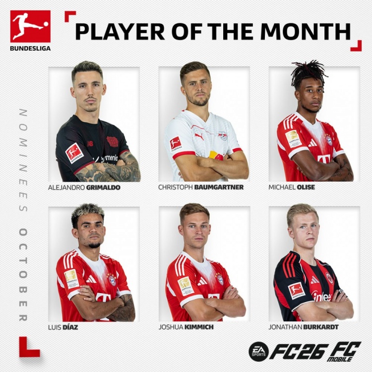 10月29日讯 本日,德甲官方公布了10月份联赛最好球员的6名候选东说念主,奥利塞领衔拜仁3将在列。