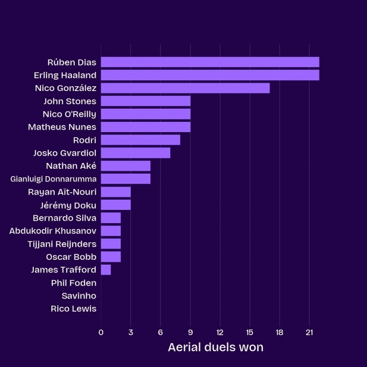 10月31日讯 数据机构squakwa统计了本赛季曼城队内的英超顺利争顶情况,哈兰德和鲁本-迪亚斯比肩最多。
