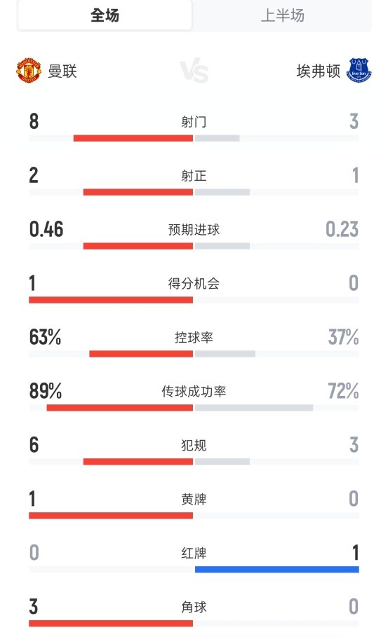 曼联半场0-1埃弗顿:射门8-3,射正2-1,控球率63%-37%,红牌0-1