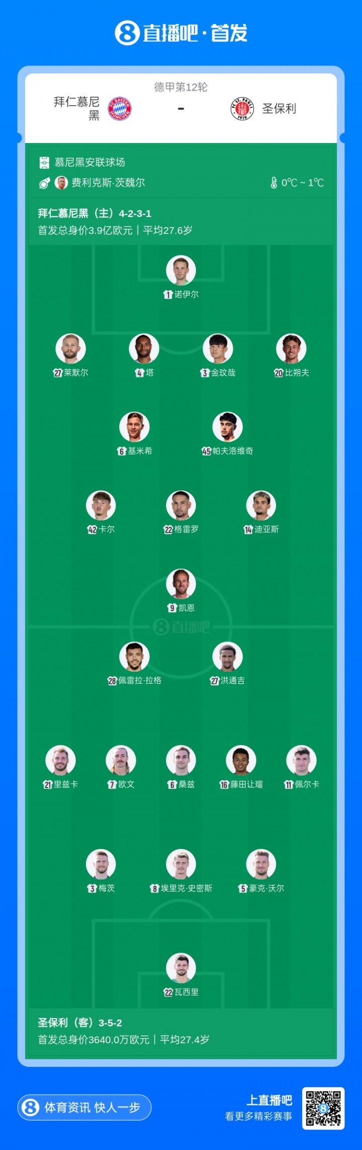 11月29日讯 北京时辰今晚22点30分,德甲第12轮,拜仁慕尼黑主场迎战圣保利,赛前两边公布首发威望。