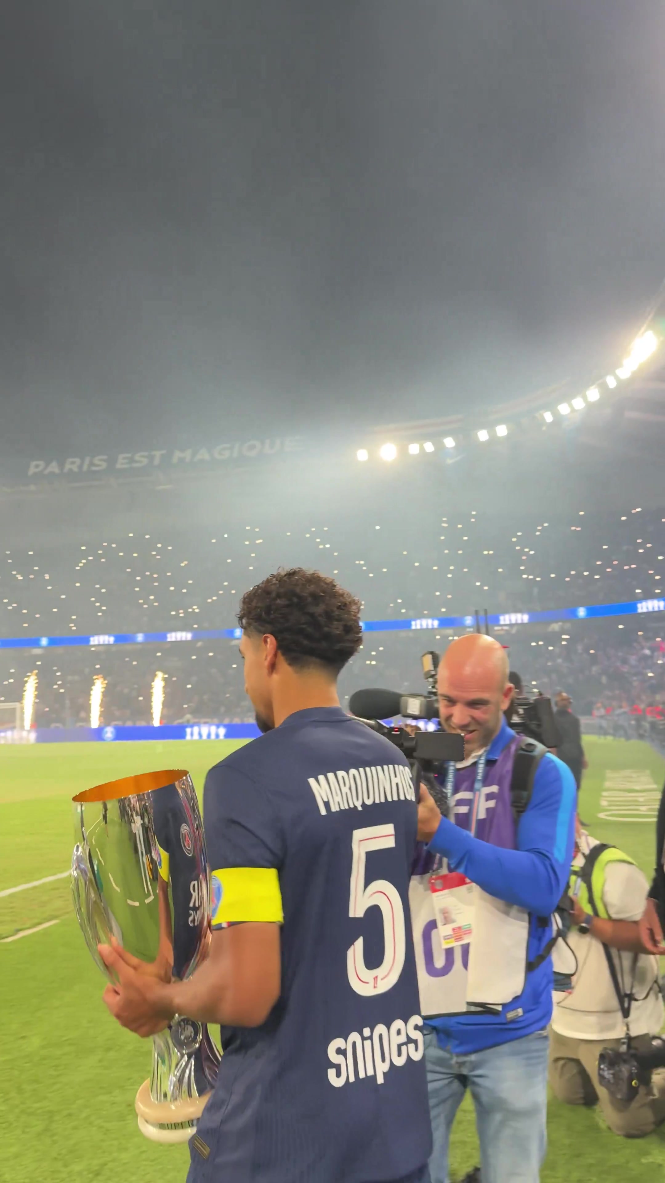 巴黎在王子公园球场展示了球队上赛季获取的奖杯,以及欧洲超等杯奖杯,俱乐部官方社媒晒出视频,配文:“咱们的冠军。”
