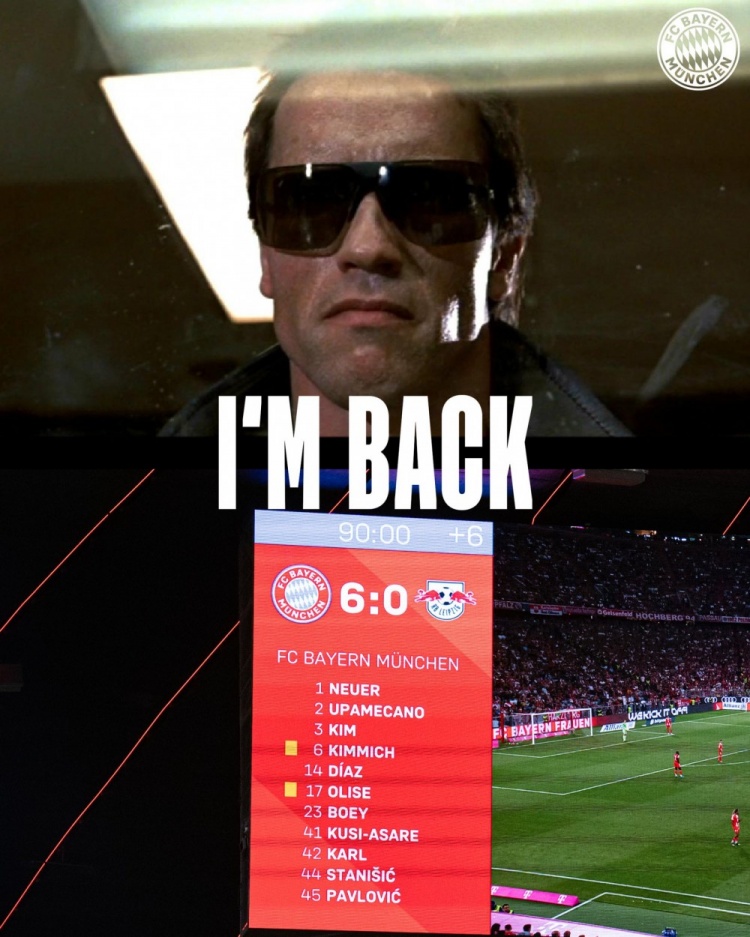 拜仁官方社媒晒出带有6-0比分牌的拔除者主题海报,配文:“I'M BACK。”