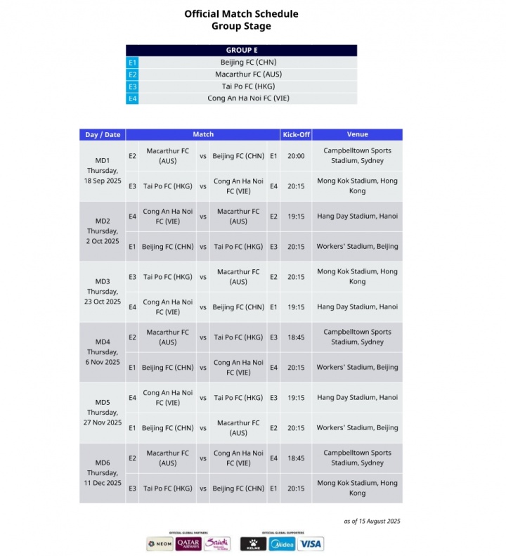E组:北京国安(中国)、麦克阿瑟FC(澳大利亚)、大埔FC(中国香港)、河内公安(越南)
