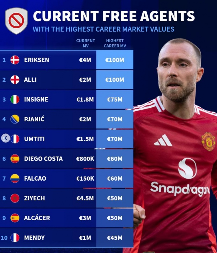 9月7日讯 主流联赛的夏窗照旧关闭,《转会商场》统计了刻下仍为开脱身的球员历史身价榜,埃里克森和阿里比肩居首。