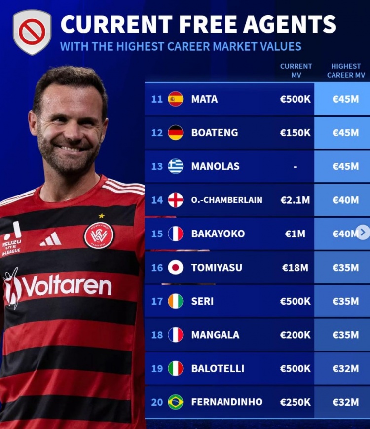 11.马塔,刻下身价:50万,糊口最高身价:4500万