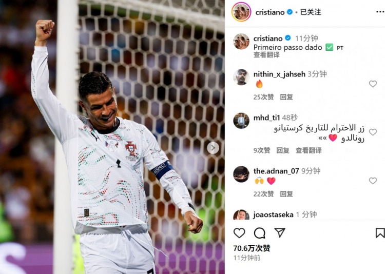 C罗也在赛后通过社媒晒出我方的振臂庆祝照,并配文:“迈出了第一步。”
