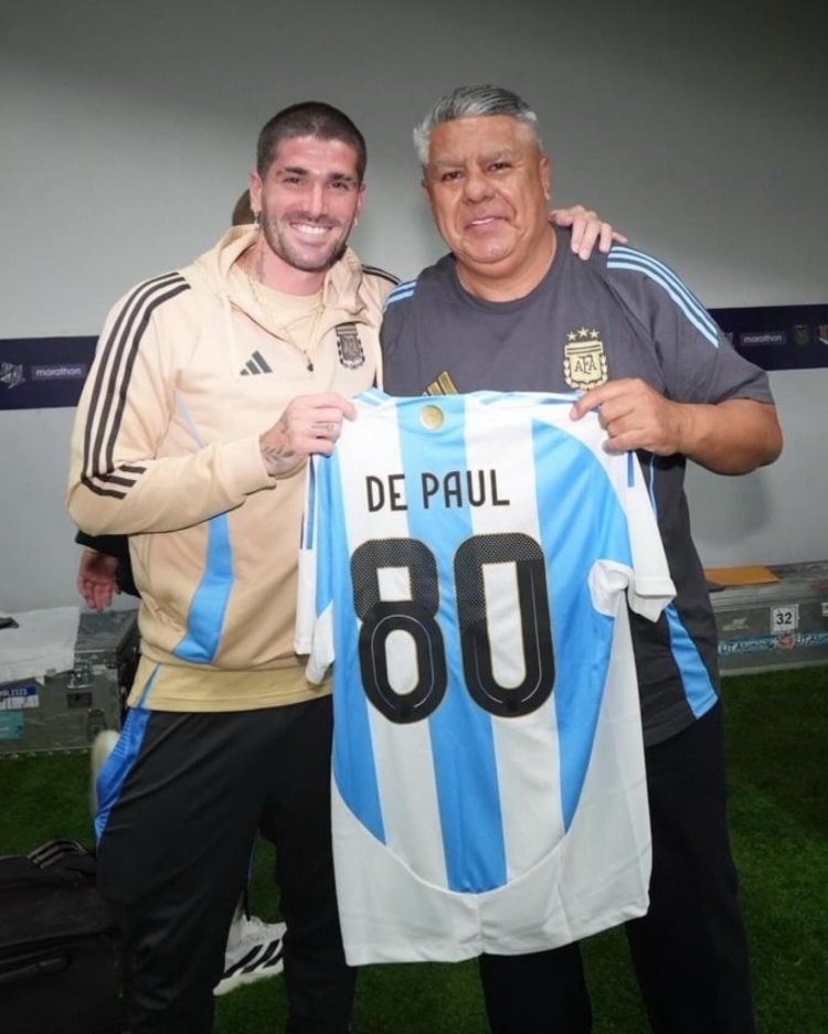 阿根廷足协主席塔皮亚赛后向德保罗颁发悲伤球衣,祝福他完了里程碑。