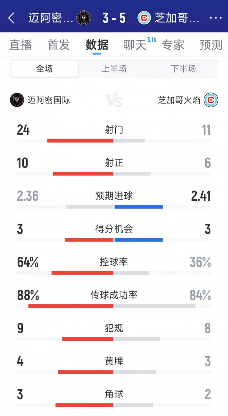 10月1日讯 在本轮好意思职联,迈阿密外洋3-5不敌芝加哥火焰,以下为两边全场数据对比: