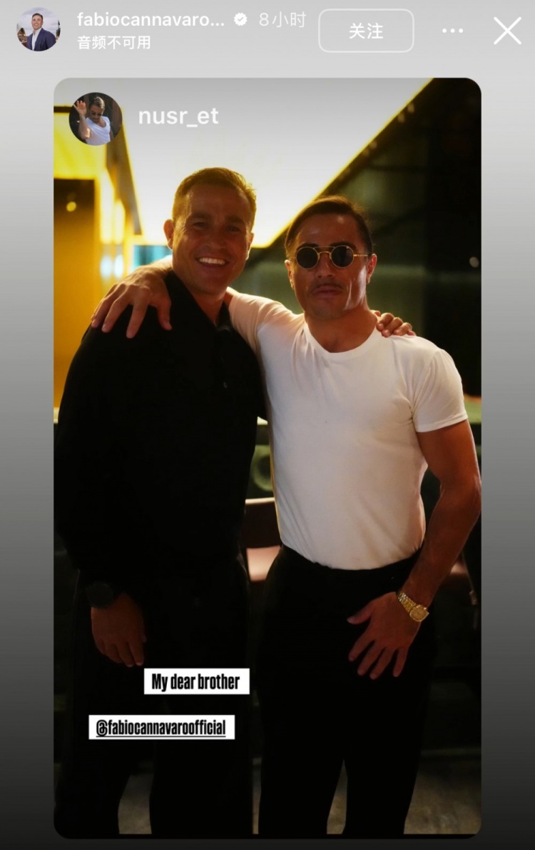 北京本事今天凌晨,卡纳瓦罗更新社媒,转发了网红“撒盐哥”社媒发出的两东谈主合照,前者称号卡纳瓦罗为“好兄弟”。像片中卡纳瓦罗依旧展现出标记性的笑颜,看上去激情很好。