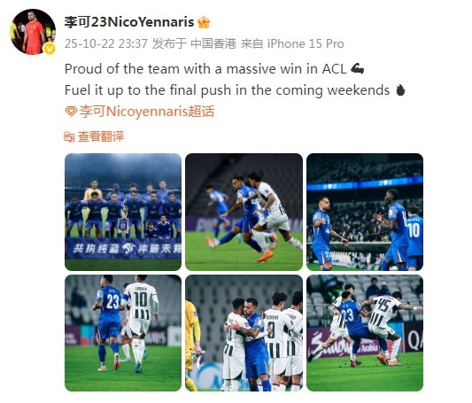 10月23日讯 亚冠精英第3轮比赛,申花主场2-0打败首尔FC,得到新赛季亚冠首胜。赛后,李可在社媒庆祝了这场告捷。