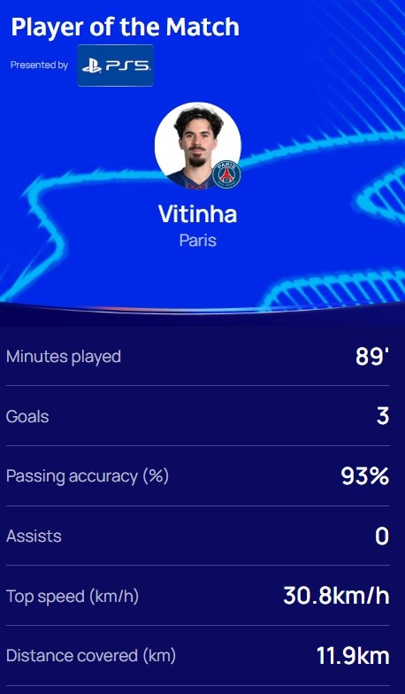 本场比赛维蒂尼亚演出帽子戏法,赛后他也当选欧冠官方评比出的本场比赛最好球员。