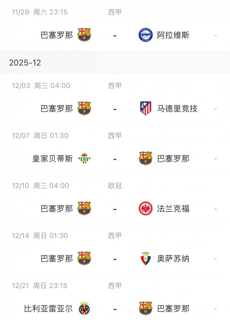 11月27日讯 据《寰宇体育报》报说念,巴萨年底将迎来用功赛程,接下来4周要进行6场比赛。