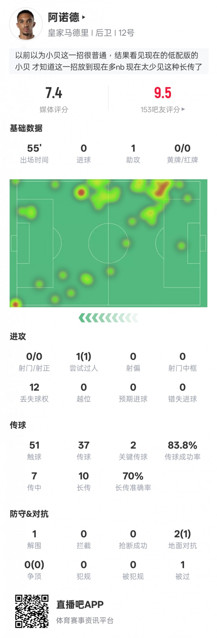 阿诺德本场比赛数据:1助攻2要害传球1过东谈主胜利,评分7.4