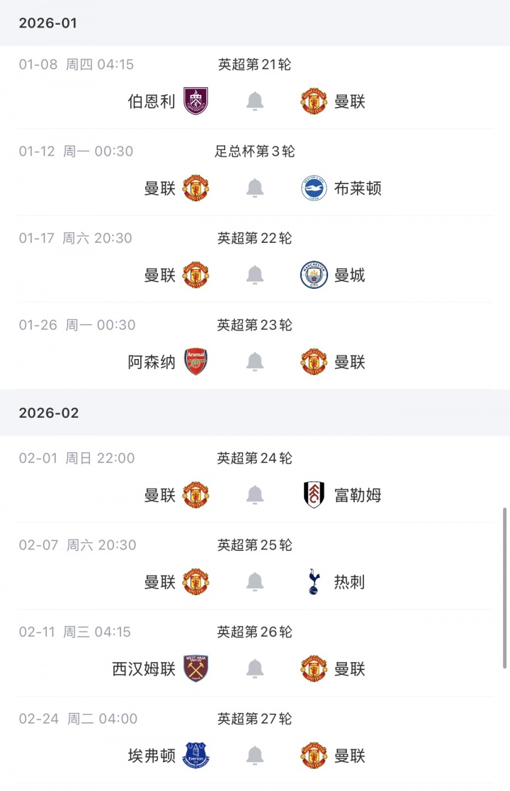 在伯恩利之后,曼联将在足总杯对阵布莱顿32强淘汰赛,接下来将流畅面临曼城和阿森纳。