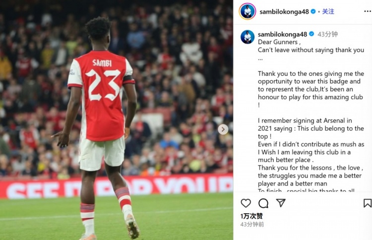 洛孔加社媒告别:未能称愿作念出更多孝顺,为阿森纳服从是我的庆幸